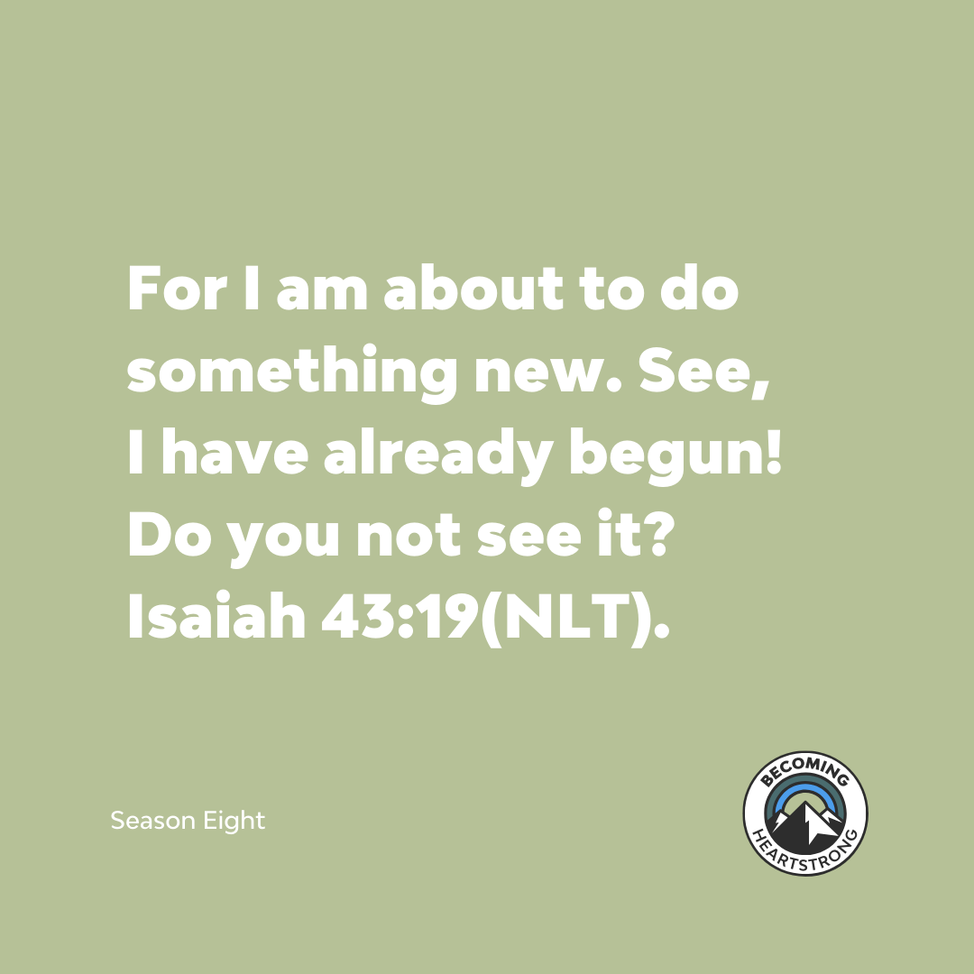 As I listened to the Heartstrong podcast that week, the following words of Isaiah came to mind. “But forget all that – it is nothing compared to what I am going to do. For I am about to do something new. See, I have already begun! Do you not see it? I will make a pathway through the wilderness. I will create rivers in the dry wasteland.” Isaiah 43:18-19(NLT).